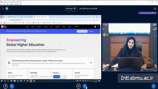 در این وبینار، خانم ملینا وطن پرور مدیر اعتباربخشی و رتبه بندی بین المللی پس از معرفی رسته های مختلف نظام تایمز، بر رسته WUR متمرکز شد و سنجه های آن را برای شرکت کنندگان تشریح کرد و نحوه بهره برداری از ظرفیت های پرتال موسسه مذکور جهت توسعه تعاملات علمی – دانشگاهی توضیح داده شد.