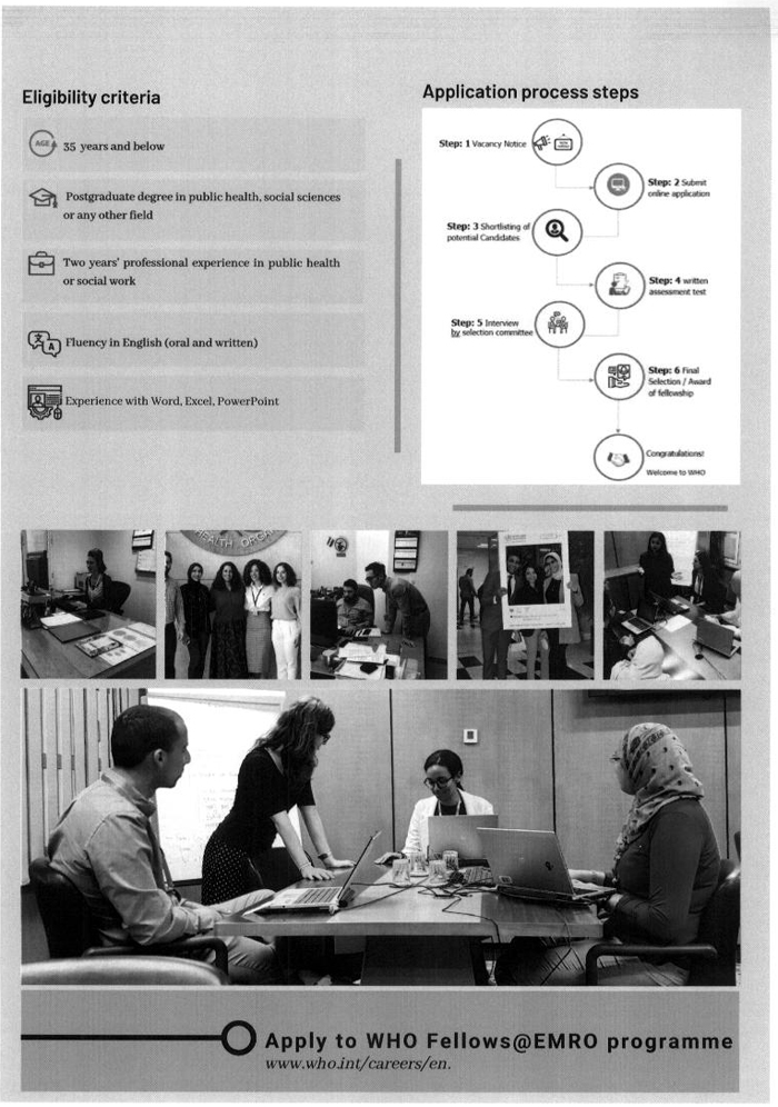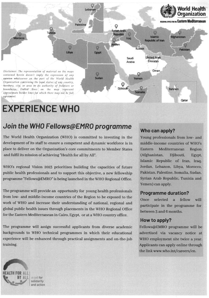 این برنامه فرصتی است برای متخصصان جوان فعال حوزه بهداشت از کشورهای با درآمد متوسط در منطقه تا در همکاری نزدیک با آن سازمان درک خود را در خصوص مشکلات بهداشت عمومی در سطح ملی، منطقه ای و جهانی از طریق حضور در دفتر منطقه ای آن سازمان در مدیترانه شرقی، شهر قاهره در مصر و یا در دفتر کشوری آن سازمان افزایش دهند.